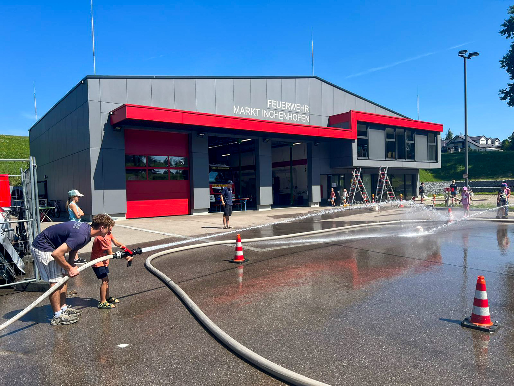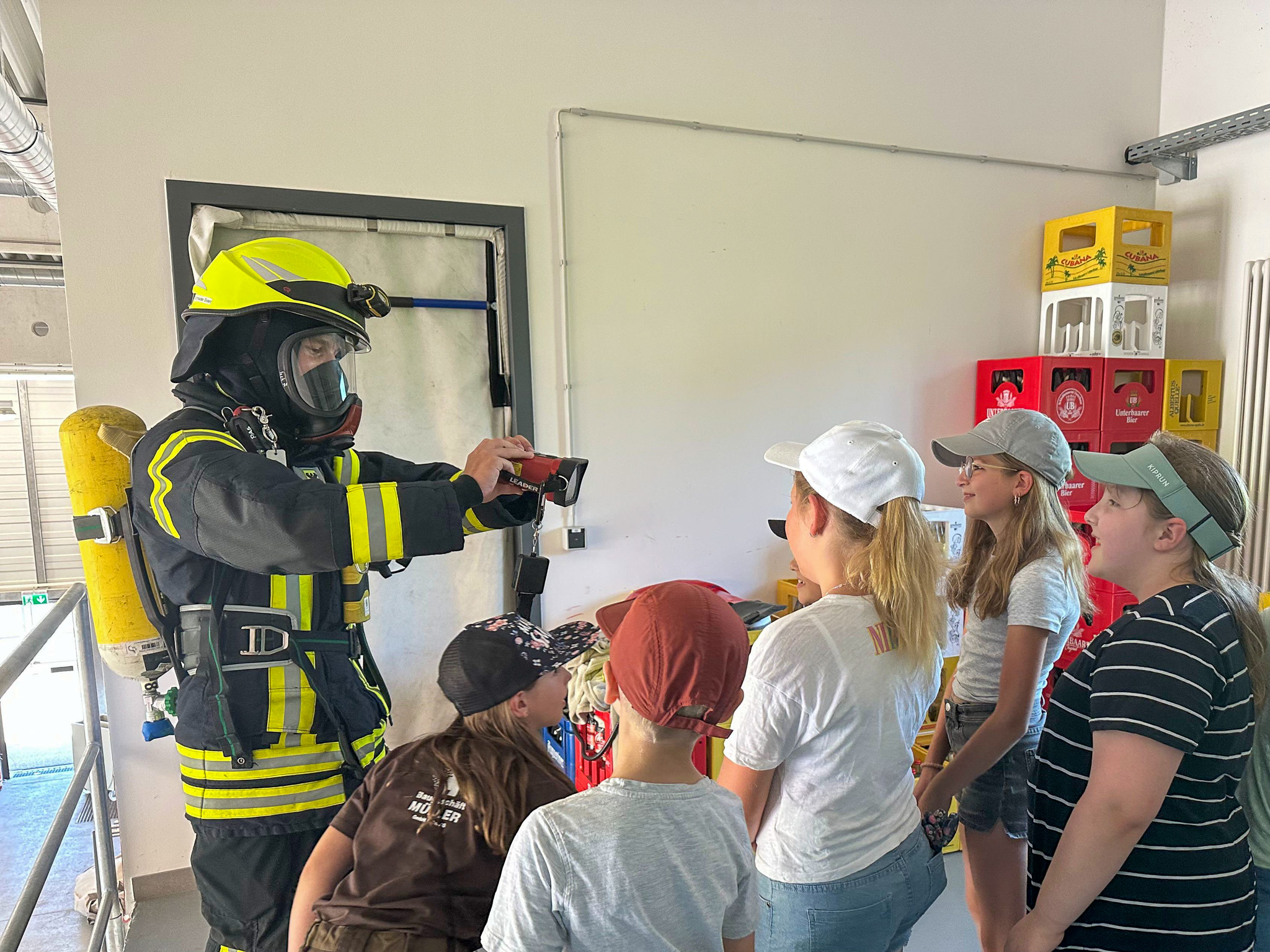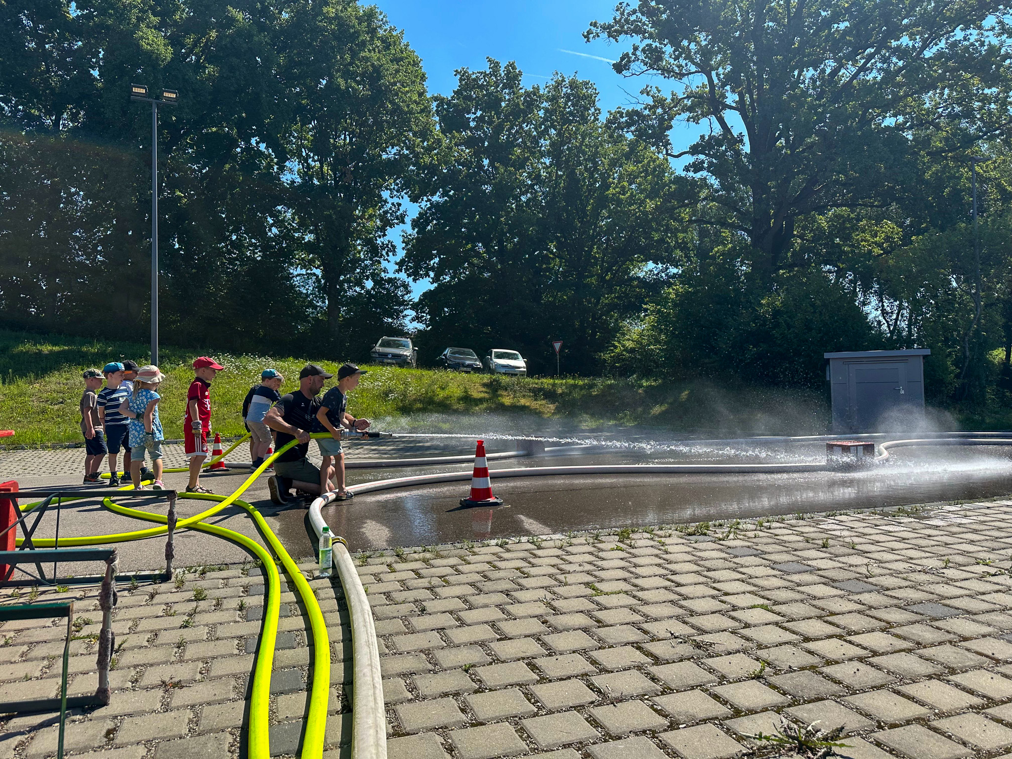 Bei heißem Sommerwetter hatten die Kinder sehr viel Spaß bei den verschiedenen Wasserspielen. Zudem konnten die Kinder zusammen mit einem Atemschutzgeräteträger durch einen verrauchten Raum gehen und dabei mit einer Wärmebildkamera heiße Tassen suchen.